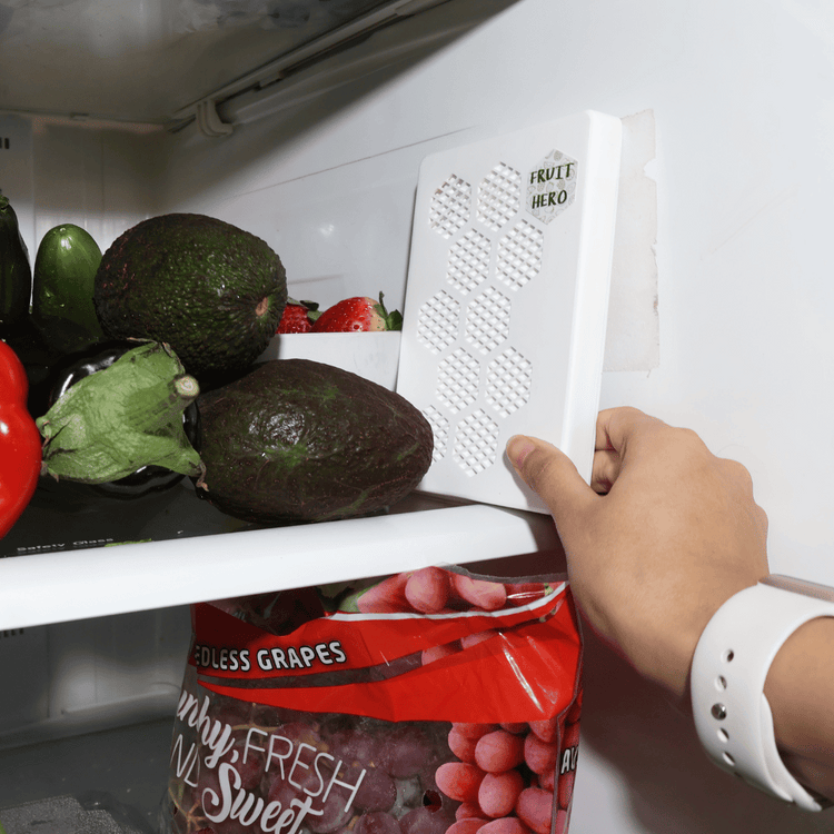 Fruit Hero helps reduce the build-up of mould and bacteria by improving the overall air quality inside your fridge. By absorbing excess moisture and unwanted gases, it creates a cleaner fridge environment where mould and bacteria are less likely to thrive. This helps keep your fridge fresher and supports longer-lasting fruit without sprays, chemicals, or extra cleaning.