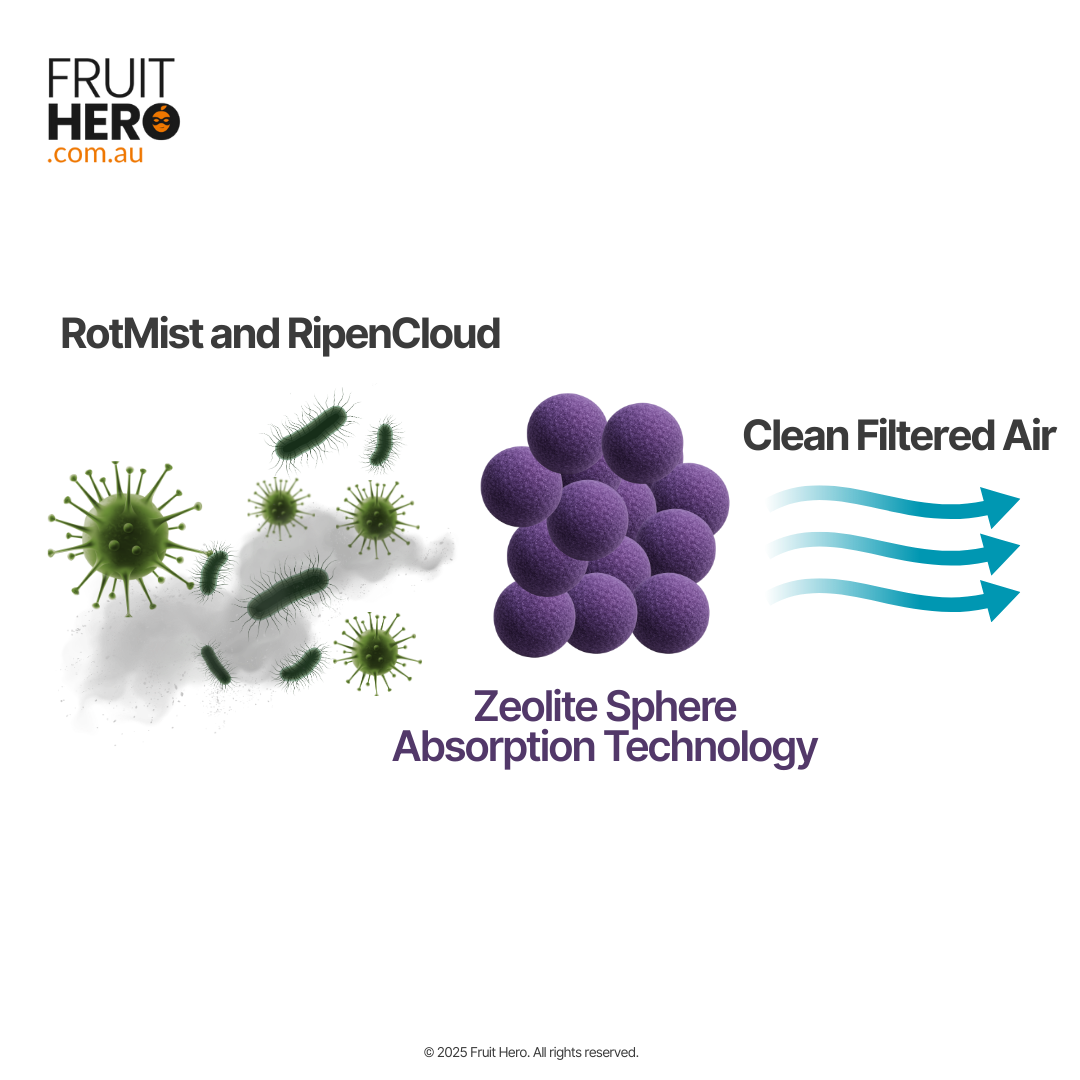 Fruit Hero Fridge Filter Pod is made to stop that. It uses special Zeolite Sphere Technology just like what big fruit warehouses use to soak up the RipenCloud™ gas and trap the RotMist™ before it can spread. That means your fruit and veg stay fresh longer, your fridge smells cleaner, and you waste less money on spoiled food.