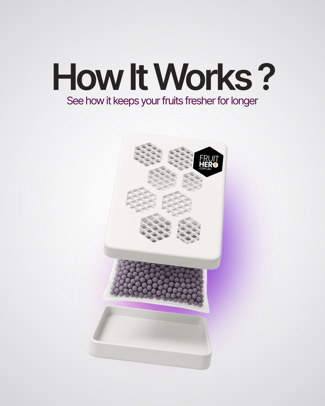 The moment you drop Fruit Hero™ Version 2.0 into your fridge, it gets to work. The purple Zeolite spheres inside start pulling in the bad stuff floating in the air the ripening gas (RipenCloud™) and the mouldy mist (RotMist™) that makes your fruit and veg go bad too fast.