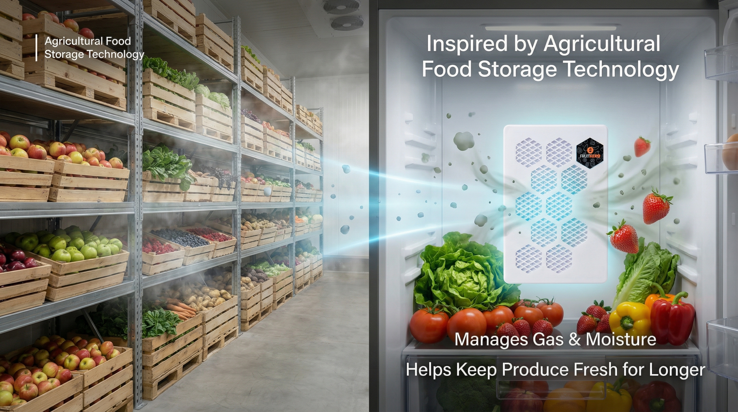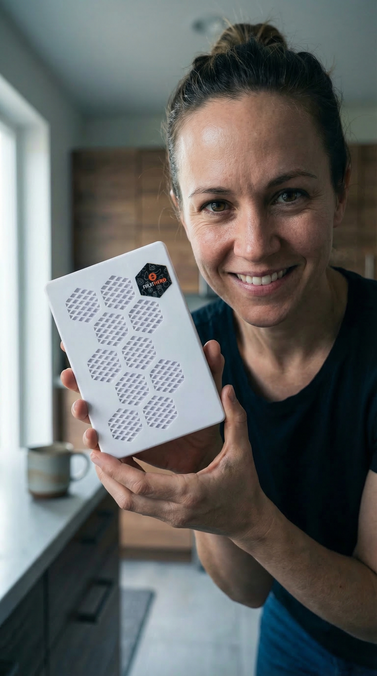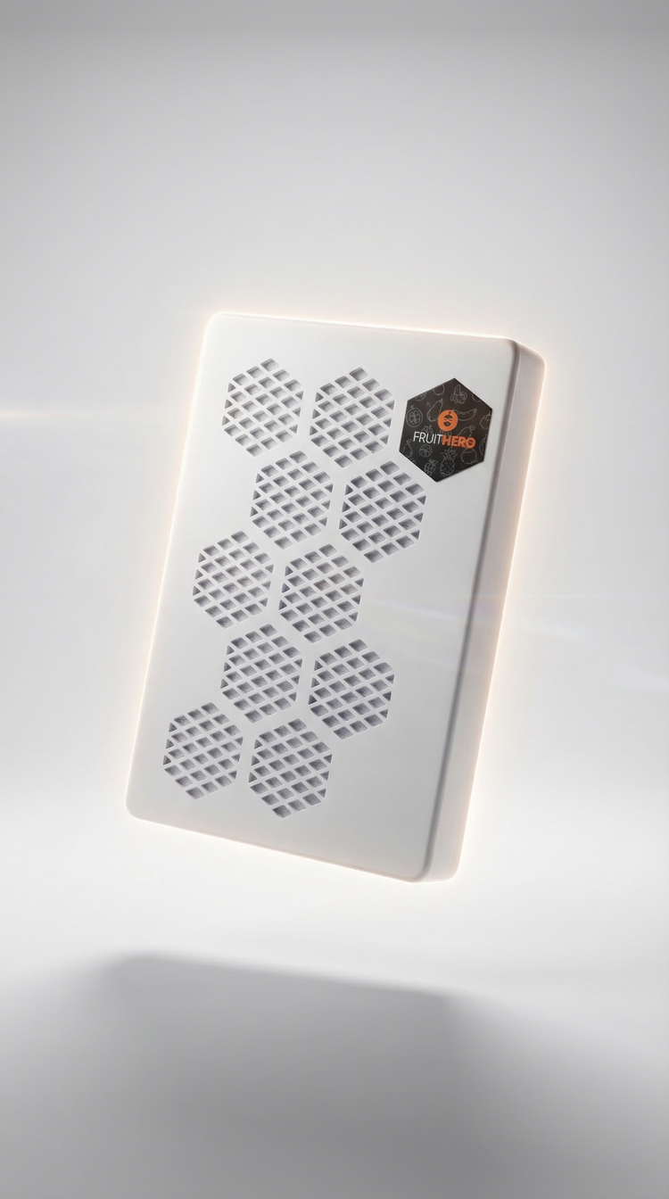 They realised the same idea could help families at home too. So they took that proven technology and transformed it into something simple: a small, natural pod that sits in your fridge and quietly filters fruit gas and moisture.